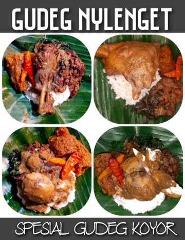 Gudeg adalah kuliner asli Kota Jogja. Hampir di setiap sudut kota jogja kita dapat menemukan kuliner legendaris yang satu ini. Tak hanya itu saja gudeg bahkan sudah terkenal dan tersebar merata di hampir seluruh kota di Indonesia bahkan gudeg sendiri kini sudah ada di beberapa negara selain Indonesia gaes . Tak heran jika Jogja sering di sebut juga dengan Kota Gudeg . Berwisata ke Kota Jogja tak afdol jika kalian gak nyicipin kuliner asli Jogja yang satu ini gaes. Buat kalian yang bingung dimana bisa menikmati gudeg enak dan murah hmmm disini tempatnya. Nama tempat kuliner nya adalah GUDEG NYLENGET SPESIAL GUDEG KOYOR yang beralamatkan di Jl. KS Tubun no 58 (Depan bakpia 555). Menu yang ada disini sangat mantap gaes selain itu juga ada bubur gudeg gaes. Hayuk langsung aja kita lihat menu nya di bawah ini.